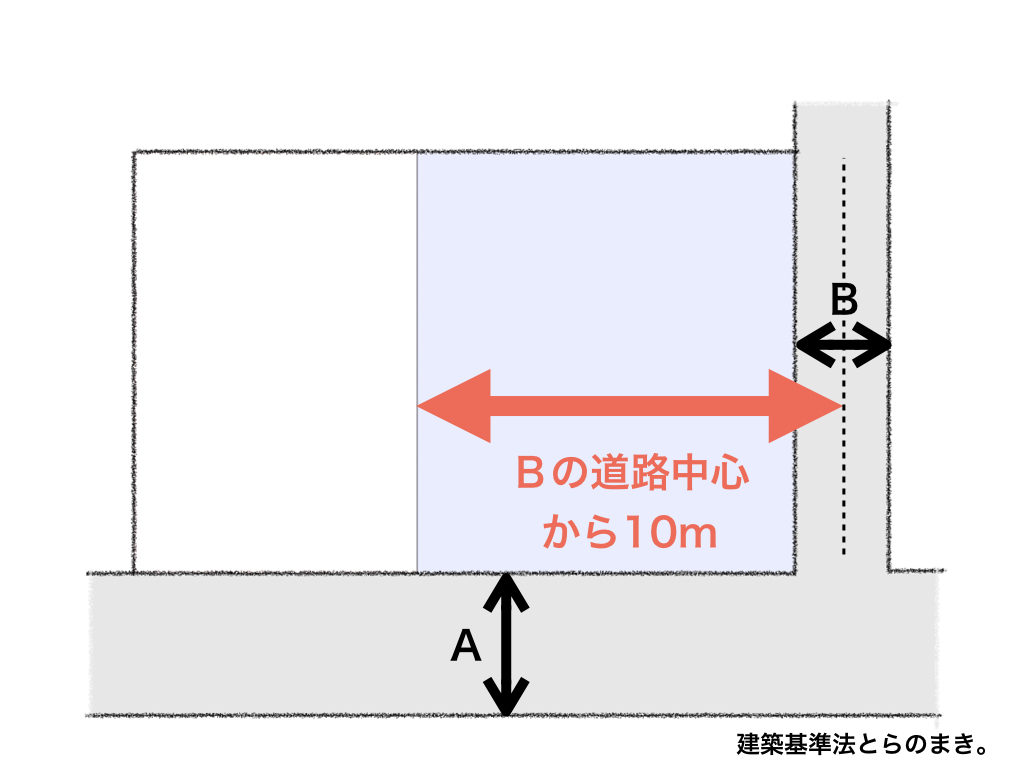 先ほどは広い道路でしたが、次は狭い道路です。図のように、今度は狭い道路Bから『道路中心から10m』のラインを引いて、その内側を薄く塗ってください。注目していただきたいのが、『道路の中心から』という事です。このあたり間違えないように。