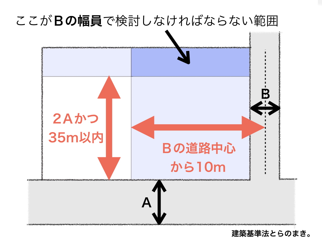 • 2A(広い方の道路幅員A×2)かつ、35m以内の部分