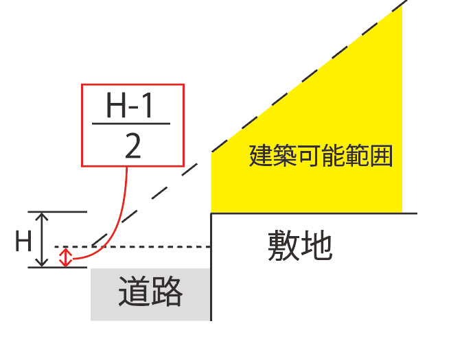 高低差緩和 道路と敷地に1mを超える高低差がある場合、算定した数値分あげた部分を道路面とみなして、道路斜線制限の算定が可能