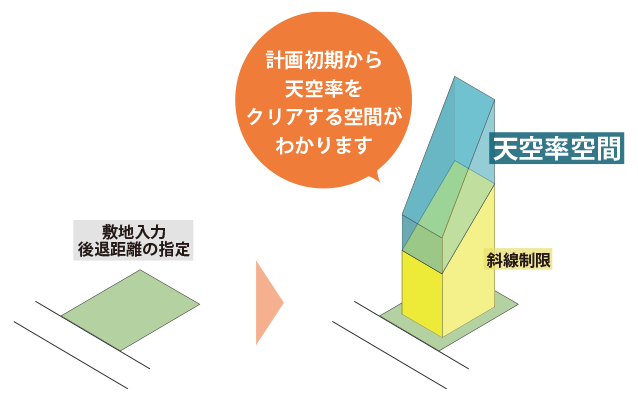 天空率空間は、天空率の知識がなくても使用可能で、『その敷地で天空率を使うと、どれくらいの高さの建築物が建てられるか?』を簡単に求めることができます。面倒な計算も不要、操作も直感的で、簡単に使用することが可能です。