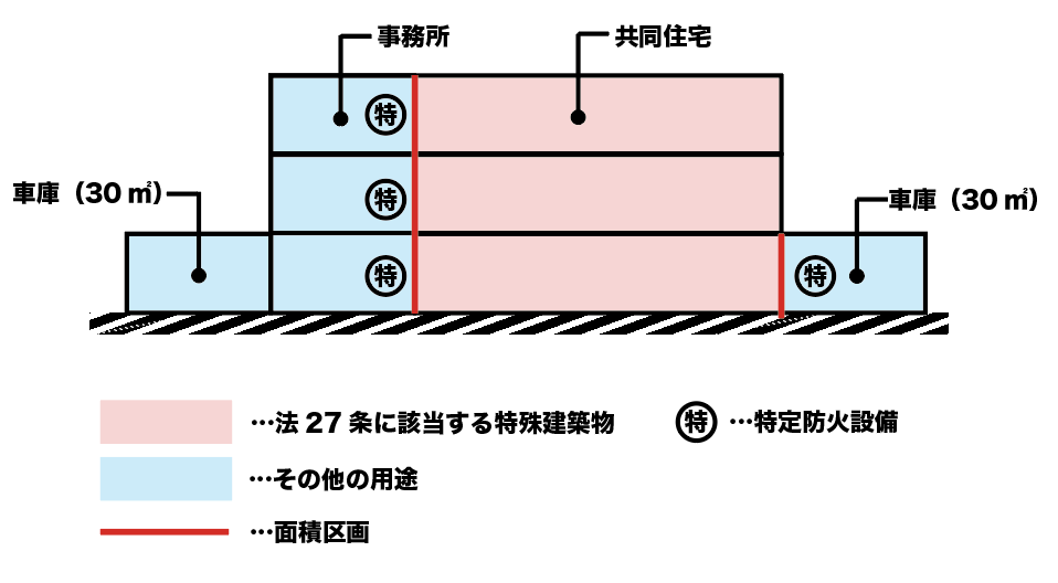 異種用途区画が必要になるのは、法27条に該当する規模・用途の特殊建築物に限る(よって、小規模な駐車場や店舗の場合は、不要となる)