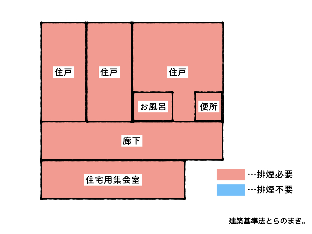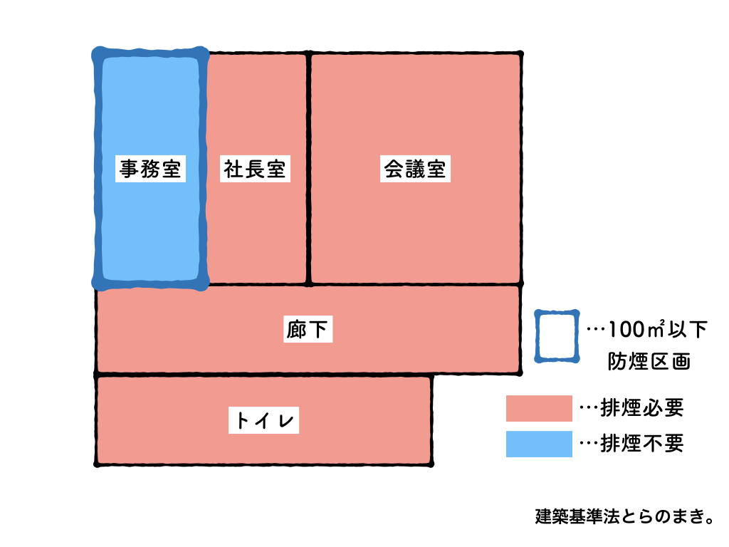 つまり法文上だと、建物によっては、便所だろうと小さな部屋だろうと、すべて室に排煙設備が必要になるという事ですね!
