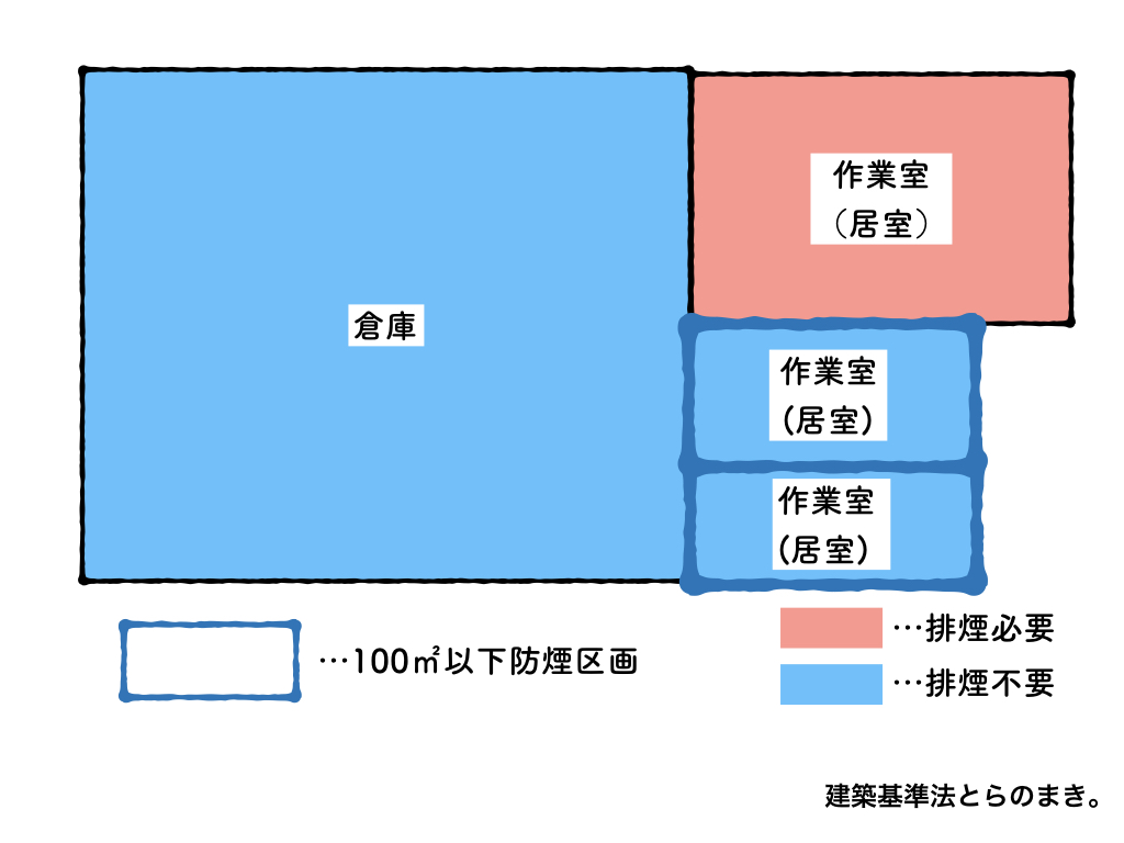 しかし、この条件で排煙設備が必要になった場合は適合はそんなに難しくありません。