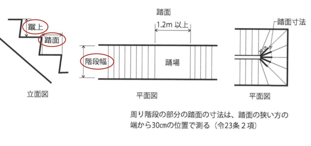 建築基準法により、階段の寸法は以下の3つが定められている