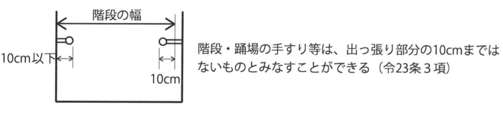 3 階段及びその踊場に手すり及び階段の昇降を安全に行うための設備でその高さが50cm以下のもの(以下この項において「手すり等」という。)が設けられた場合における第1項の階段及びその踊場の幅は、手すり等の幅が10cmを限度として、ないものとみなして算定する。