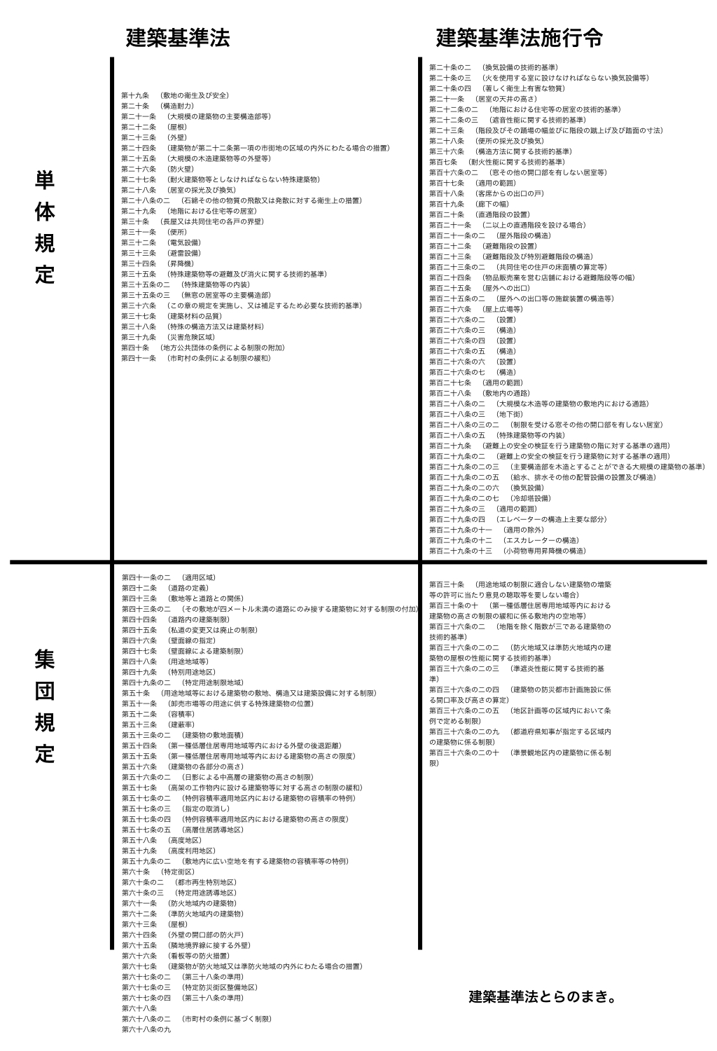 建築基準法、建築基準法施行令どちらも、綺麗に分かれているので