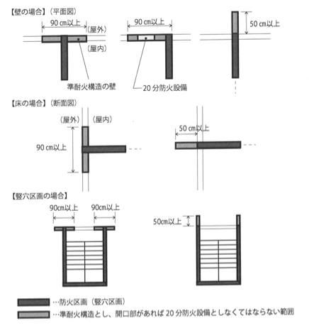 面積区画とぶつかる外壁は、そこを含む90㎝以上の外壁を準耐火構造とするか、50㎝以上突出した庇を準耐火構造とし、開口部があった場合は防火設備としなくてはなりません。