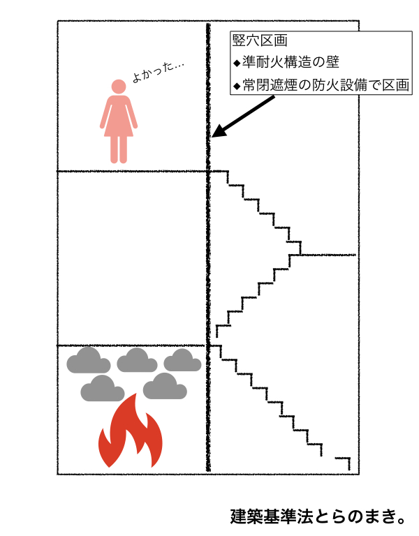 竪穴区画とは、防火区画の1つで、火災で発生した煙を特定の階に留めておくための規制