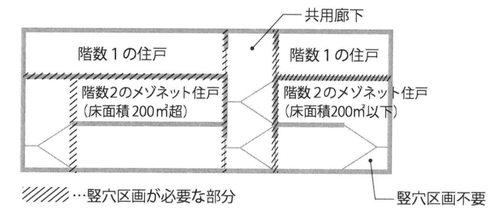一戸建て住宅だけでなく、長屋・共同住宅も竪穴区画の緩和があります。共同住宅は、住戸内に階段がある、いわゆるメゾネット住戸が対象です。