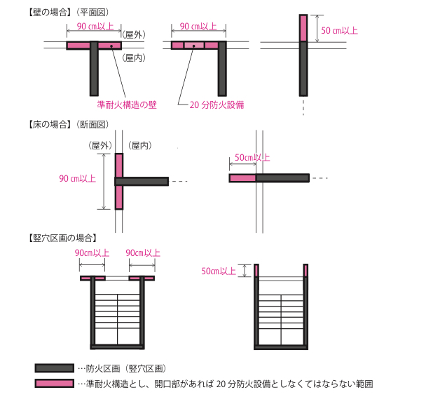 面積区画とぶつかる外壁は、そこを含む90㎝以上の外壁を準耐火構造とするか、50㎝以上突出した庇を準耐火構造とし、開口部があった場合は防火設備としなくてはなりません。
