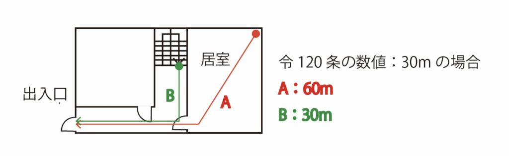 - 避難階の各居室から主要な出入口まで『令120条の歩行距離×2』以下とすること