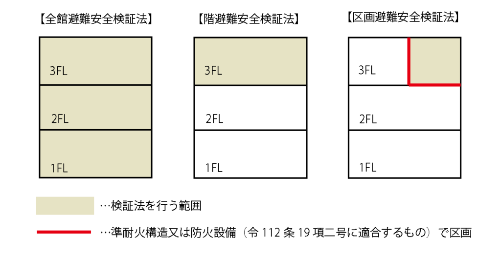 避難安全検証法には、全館・階・区画の3つがあり、適用除外の内容も異なる
