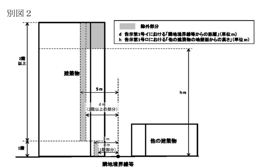 ロ 建築物の外壁面と隣地境界線等との角度に応じて、当該建築物の周囲において発生する通常の火災時における火熱により燃焼するおそれのないものとして国土交通大臣が定める部分